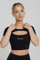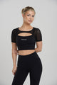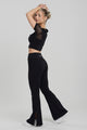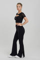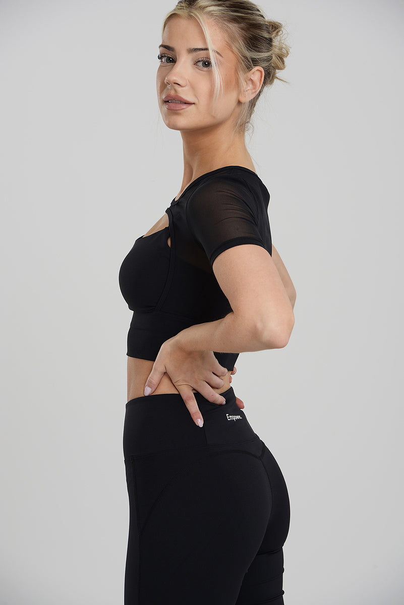 Bolero Contouring Flare Set – ett elegant svart träningsset som kombinerar stil och funktion. Setet består av en unik t-shirt med bolero-design, där den övre delen är i transparent mesh som andas och ger en sportig, feminin touch.