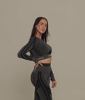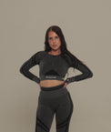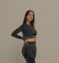 Amalia Long Sleeve Top, seamless grå top med hål för tummen i tyg som andas. Materialet är även mjukt, stretchigt och följsamt. En tröja man gärna har på sig både på gymmet och utanför. Glöm inte att köpa matchade leggings till! Finns även att köpa som ett helt set.